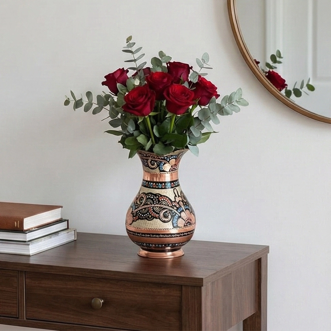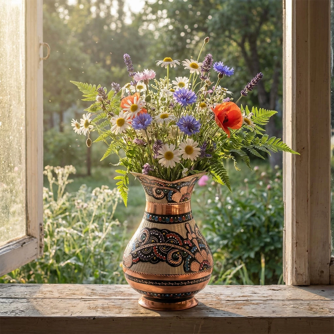 Bu vazo, sadece çiçeklerinize ev sahipliği yapmakla kalmaz, aynı zamanda başlı başına bir sanat eseri olarak evinizin en seçkin köşesini süsler. Konsolunuzun üzerinde, şöminenizin kenarında veya orta sehpanızda… Nereye koyarsanız koyun, bakırın asil parıltısı ve üzerindeki göz alıcı desenlerle mekanınıza anında otantik ve lüks bir hava katacaktır. Geleneksel sanatın modern dekorasyonla kusursuz uyumunu sergileyen bu vazo, evinize sanatsal bir ruh ve tarihi bir derinlik kazandırır.