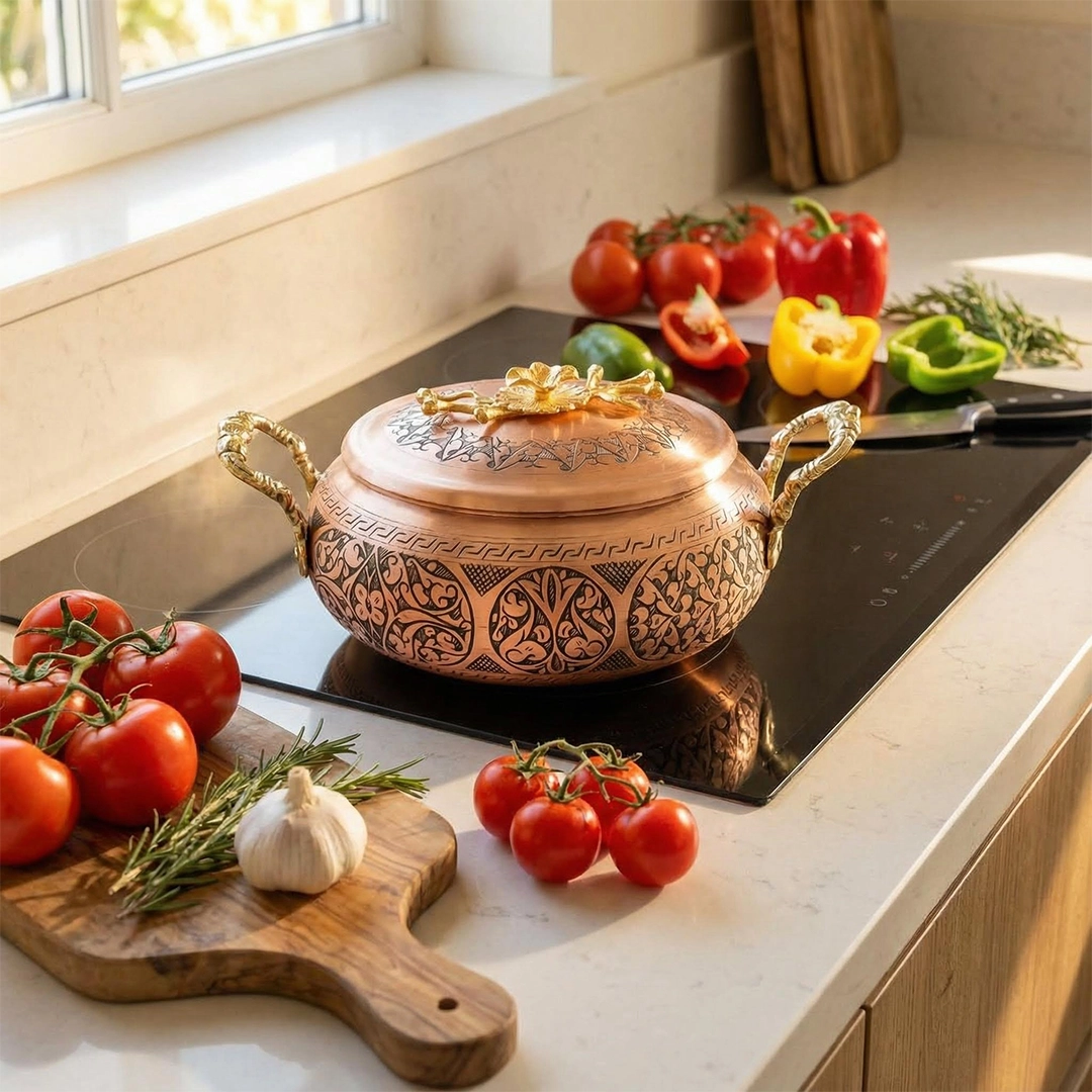 Bakırın ısıyı eşit ve hızlı yayma özelliği sayesinde yemekleriniz daha lezzetli pişerken, pirinçten yapılmış zarif kulpları ve kapak tutamacı tasarıma şıklık katar. Onu ister ocağınızın üzerinde bir başyapıt gibi sergileyin, ister en özel davetlerinizde sunumlarınızın yıldızı yapın. Bu tencere, fonksiyonelliği ve estetiği bir araya getirerek mutfak geleneğine modern bir saygı duruşunda bulunur.